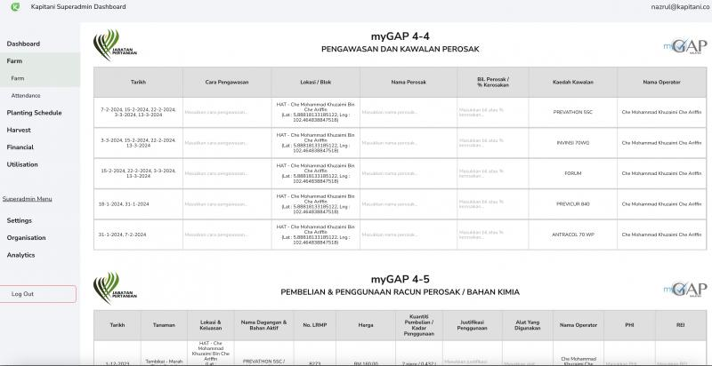 - **Farm Diary:** A digital log that records daily farm activities such as planting, irrigation, fertilization, and harvesting. This diary aids farmers in documenting processes required for myGAP audits, ensuring they maintain high operational standards and traceability.