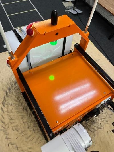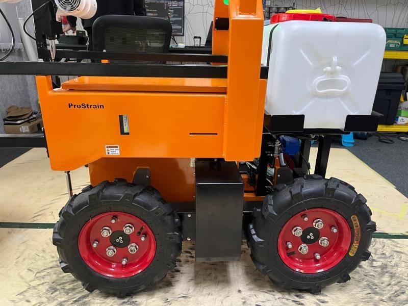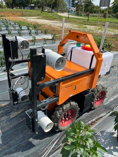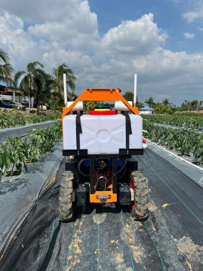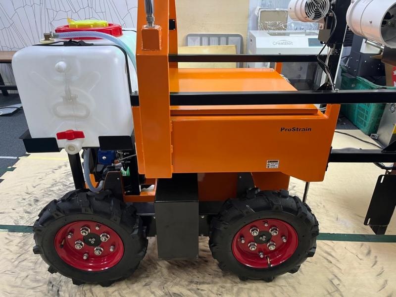 The all-terrain mobile robot is designed for outdoor tasks and is capable of navigating a wide variety of surfaces, including uneven and unpaved agricultural terrain. Its uniquely designed chassis ensures stability and consistent ground contact, which enhances the robot's mobility and performance.