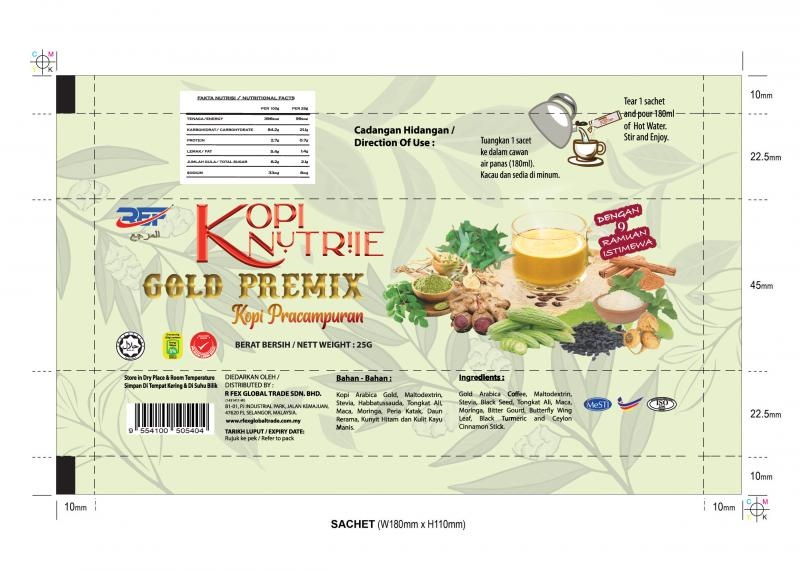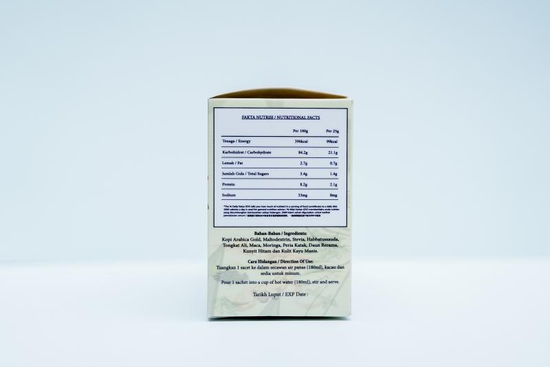 Kopi Nutriie 9in1 Premix is a functional & natural drink designed to support overall health, vitality and daily performance. Formulated with a blend of 9 essential nutrients and natural ingredients, Kopi Nutriie 9in1 Premix aims to provide a convenient, all-in-one solution for any individuals seeking to maintain wellness without compromising on taste and affordability. The 9 ingredients are: Habbatussauda, Black Turmeric, Stevia, Butterlfy Wing Leaf, Tongkat Ali, Maca, Moringa, Bitter Gourd & Cinnamon Sticks. While savouring a cup of coffee, one will encounter much health improvements with daily and consistent consumption.