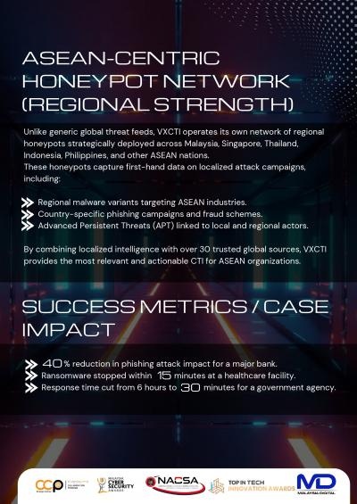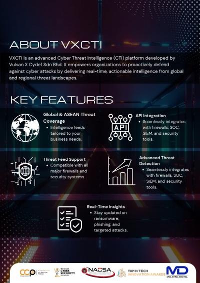 VXCTI (VX Cyber Threat Intelligence) is a cutting-edge threat intelligence solution developed by Vulsan X to provide organizations with real-time visibility into the global and regional threat landscape. It gathers and analyzes cyber threat data from over 30 trusted international sources, as well as proprietary honeypots strategically deployed across Malaysia and Southeast Asia. This dual-source approach enables VXCTI to offer both high-level global threat intelligence and hyper-local insights specific to the region.